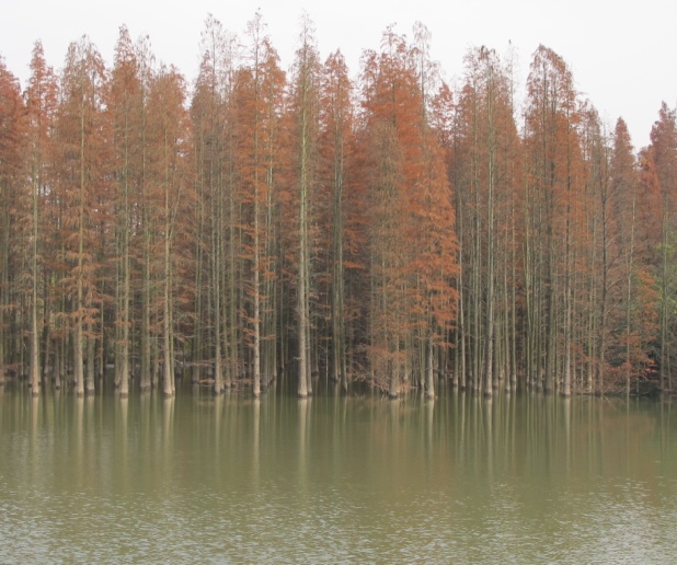 隨著船我們到了第二站“水上森林”,湖面上的水杉更是讓人目不轉睛,雖已是初冬,秋天的顏色卻還沒有完全褪去。筆直的水杉,平靜如鏡的湖面是那么的和諧,那么的安靜,同事們都被眼前的美景吸引,也為這份寧靜所震撼。